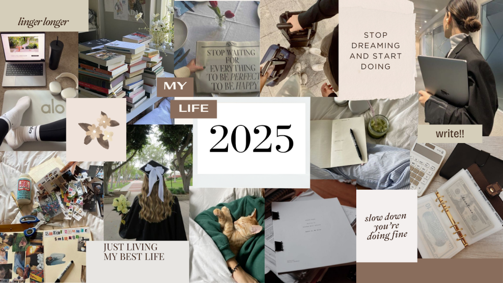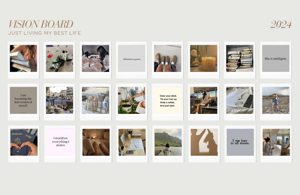 This step is optional, but as a creative and visual gal, I love to see my goals and be reminded of them all year. I love to create a vision board using Pinterest and Canva and set is as my laptop wallpaper for the entire year. Every time I open my laptop, I am reminded of my goals and things I’m working towards. Your vision board can include anything you want, but here are some ideas: